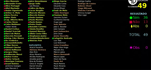 A aprovação foi por 36 votos favoráveis, contra 13 contrários. O detalhe para o Maranhão é que os dois únicos deputados maranhenses que integravam a Comissão Especial – Cléber Verde (PRP) e João Marcelo (MDB) – estavam ausentes da votação, conforme mostra o painel abaixo.
