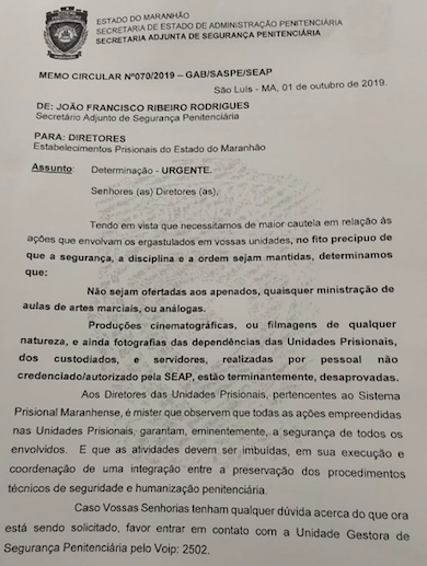 A decisão foi do secretário adjunto da SEAP, João Francisco Rodrigues, que através de circular proibiu a polêmica prática. Veja abaixo.