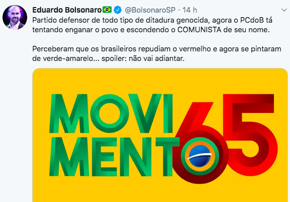 O deputado federal mais votado na história do Brasil, Eduardo Bolsonaro, utilizou as redes sociais para “detonar” o tal Movimento 65, que, depois de muita especulação, foi lançado nesta semana pelo PCdoB.