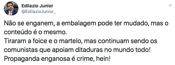 No entanto, para Eduardo Bolsonaro, filho do presidente da República, Jair Bolsonaro, a inciativa não vai funcionar. O deputado federal afirmou que agora o PCdoB tenta esconder o vermelho e se “pintam” de verde e amarelo para enganar o eleitor brasileiro.