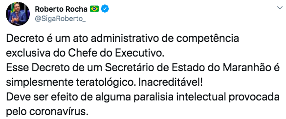 No entanto, o senador Roberto Rocha (PSDB), classificou o recuo do Governo Flávio Dino como um ato teratológico. O senador maranhense lembrou que o Decreto é um ato administrativo, só podendo ser assinado exclusivamente pelo próprio governador e não por um secretário.