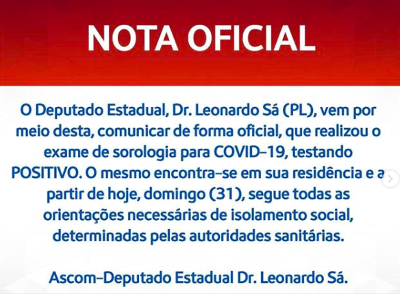 Além de Leonardo Sá, outros cinco deputados estaduais já testaram positivo. Daniella Tema, Andreia Rezende, Helena Duailibe, Carlinhos Florêncio e Thaiza Ortegal também confirmaram publicamente que contraíram a doença.