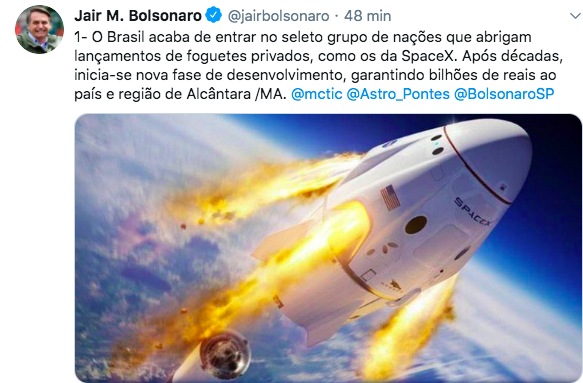 Nesta semana, foi publicada portaria, pelo Ministério da Ciência, Tecnologia, Inovações e Comunicações do Brasil , autorizando que empresas como a SpaceX lancem foguetes da Base de Alcântara, no Maranhão. A exploração comercial do centro de lançamento é uma das bandeiras do governo Jair Bolsonaro.