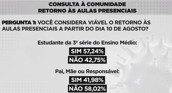 Na coletiva da última sexta-feira (31), de maneira acertada, Dino confirmou a informação dada pelo secretário de Educação do Maranhão, Felipe Camarão, que após uma consulta aos pais e alunos da rede pública estadual, percebendo ainda incertezas e receios, decidiram por mais uma vez adiar o retorno das aulas presenciais, que seria dia 10 de agosto e agora sem data definida.