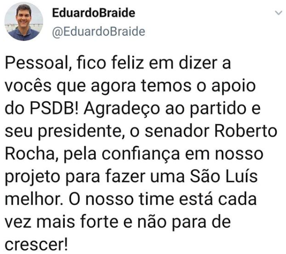 Após a decisão do PSDB de São Luís, através do ex-vereador Roberto Rocha Júnior, que confirmou que o partido não terá candidatura a prefeito da capital e apoiará a pré-candidatura do deputado federal Eduardo Braide (Podemos), o presidente do PSDB no Maranhão, senador Roberto Rocha se posicionou e o próprio Braide agradeceu.