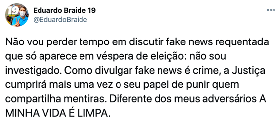 “Não vou perder tempo em discutir fake newsrequentada que só aparece em véspera de eleição: não sou investigado. Como divulgar fake news é crime, a Justiça cumprirá mais uma vez o seu papel de punir quem compartilha mentiras. Diferente dos meus adversários, a minha vida é limpa”, assegurou o candidato.