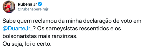 A decisão, obviamente, deixou muitas pessoas espantada com a subserviência e que diminuiu o político e até mesmo o cidadão Rubens Júnior. No entanto, tentando se enganar ou enganar quem um dia acreditou na sua revolta defendendo a sua família, Rubens ainda disse que somente sarneysistas ressentidos e bolsonaristas mais ranzinzas reclamaram da sua vexatória decisão.
