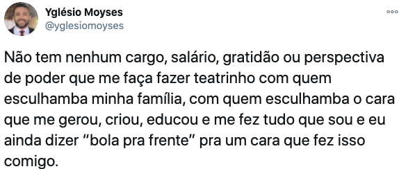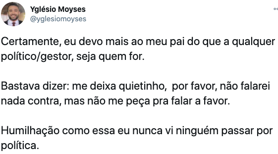 Veja abaixo a opinião sensata, equilibrada e madura de Yglesio diante do episódio e da decisão vassala de Rubens Júnior, que envergonhou não apenas sarneysistas e/ou bolsonaristas, mas qualquer pessoa, independente de ser político ou não, que possua amor próprio e por seus familiares.