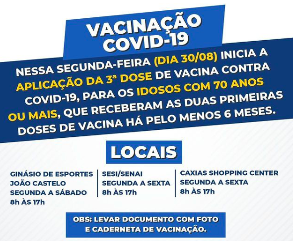 A Prefeitura de Caxias disponibilizou três locais, no horário das 8h às 17h, para que os idosos, a partir dos 70 anos, se imunizem com a 3ª dose da vacina contra a Covid-19.