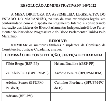O Diário Suplementar da AL apresentou a nova composição da CCJ, com quatro deputados ligados a Brandão – Fábio Braga (Solidariedade), Zé Inácio (PT), Adelmo Soares e Adriano Sarney (PV) – e três ligados a Weverton – Márcio Honaiser, Ricardo Rios (PDT) e Wendel Lages (PMN).