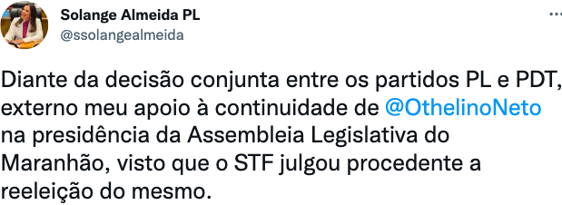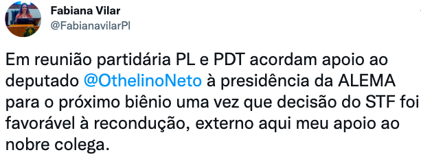 Vale ressaltar que após a recomendação do PL, além de Fabiana Vilar, a deputada estadual Solange Almeida também já declarou apoio a Othelino.