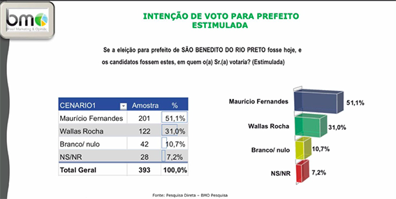 De acordo com dados da pesquisa, Maurício Fernandes teria 51,1% das intenções de voto, contra 31% do atual prefeito Wallas Rocha (PSC), brancos/nulos somam 10,7%, NS/NR 7,2%.