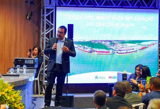 Diante do presidente do BNB, Paulo Câmara e do governador Carlos Brandão, o presidente do Porto do Itaqui, Gilberto Lins, falou sobre projetos de expansão que significarão mais de R$ 1 bilhão de investimentos em sua infraestrutura, principalmente na construção de novos berços de atracação.