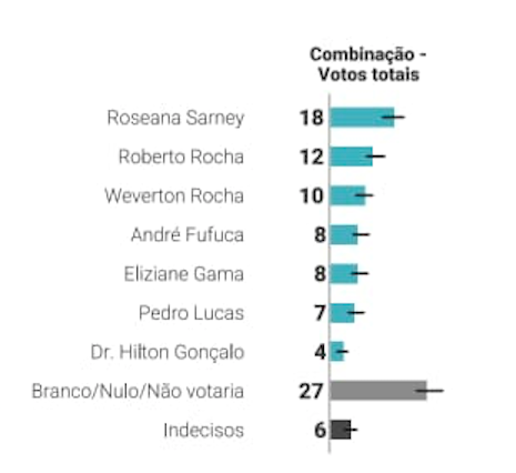 Num último cenário, sem Brandão e com Roseana, é a ex-governadora que aparece em primeiro com 18%, seguido de Roberto Rocha com 12%. Depois aparecem: Weverton, Fufuca, Eliziane e Pedro Lucas. Veja acima.