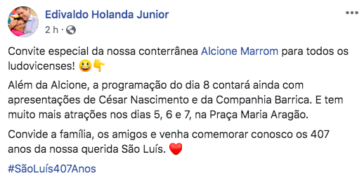 Além da maranhense Alcione, o pedetista também anunciou mais atrações locais como César Nascimento, Companhia Barrica, Tribo de Jah e Mesa de Bar. Mais uma vez, Edivaldo mostra que a sua gestão valoriza os artistas da terra, incentivando a cultura e dando oportunidade ao público de curtir gratuitamente e com uma grande estrutura nomes da música local e nacional.