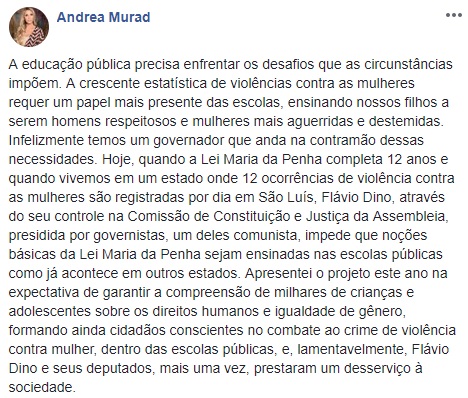 “Quero pedir à Roseana que pensasse na possibilidade de irmos além da sua proposta de parcelamento do IPVA. Muitos beneficiados do Bolsa Família que têm sua moto possam ser isentos de pagar o IPVA. E mais, que a futura governadora possa também garantir a eles a habilitação que também é cara. Peço muito que pense nessa sugestão com carinho e ajude essas famílias a viverem na regularidade, com segurança, porque a gente sabe que na zona rural não tem transporte público, o que essas famílias têm é a sua moto pra fazer tudo. Precisamos ajudar essas pessoas a melhorarem de vida e não piorar como fez Flávio Dino”, discursou Andrea.