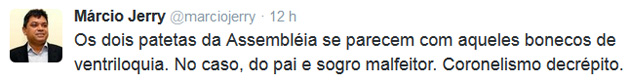 Destempero – Pior ainda foi o destempero e desequilíbrio do secretário de Assuntos Políticos do Governo Flávio Dino, Márcio Jerry. Após o pronunciamento dos dois deputados estaduais, Jerry foi as redes sociais e os classificou de ‘patetas’ e ‘bonecos ventriloquia’.
