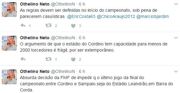 Othelino citou também a questão do Campeonato Maranhense, com a mudança imposta pelo Tribunal de Justiça Desportiva, que modificou a final do segundo turno do torneio para o Cordino, que não terá mais como adversário o Sampaio e sim o Moto.