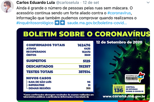 Curioso é que no dia 12 de setembro, ou seja, no mesmo dia da convenção que Carlos Lula participou, o secretário de Saúde postou nas redes sociais um texto lamentando a quantidade de pessoas ainda sem máscaras.