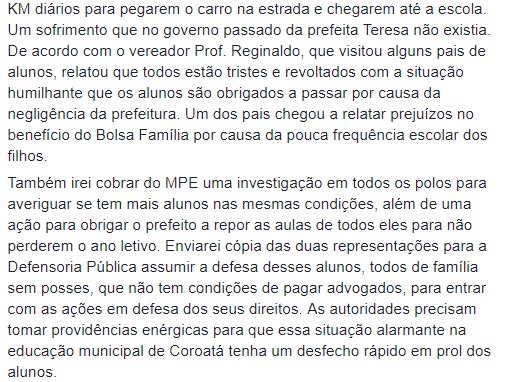 “Estamos todos estarrecidos com o que vemos acontecer no município de COROATÁ. A volta dos barracões e das séries multisseriadas que foram ERRADICADAS na gestão de Teresa Murad. Mas com Luis da Amovelar na prefeitura, esta é a realidade que retorna ao ensino público municipal. Escola localizada no povoado Poção, em Coroatá, coberta de palha, tampada de talo, piso de barro, condições precárias, é um absurdo. Barraco usado antes como paiol de arroz do proprietário e agora alugado por um professor – já identifica como João – por R$ 150,00 para Prefeitura de Coroatá instalar uma “escola”, é um verdadeiro retrocesso. A denúncia feita pelo vereador Camilo Garret, ontem na Câmara, quando relatou suas visitas a algumas escolas da zona rural, inclusive, denunciando falta de merenda escolar em 3 dias da semana, requer uma ação imediata de todas as frentes para fechar esta vergonha para todo o Brasil. Irei denunciar também ao Procurador Geral de Justiça, Luiz Gonzaga, exigindo ação imediata para fechar isso que estão chamando de “escola” e determinar que os alunos sejam matriculados em unidades da rede municipal nas suas respectivas séries e conduzidos pelo transporte escolar como era feito na administração da prefeita Teresa Murad, que acabou com esse tipo de escola indigna e que jamais deveria retornar”, escreveu a parlamentar.