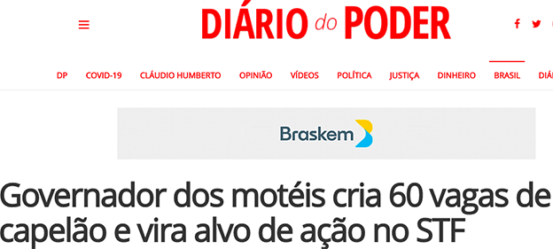 O Diário do Poder, um dos principais sites políticos do Brasil, iniciou o dia com a postagem: “Governador dos motéis cria 60 vagas de capelão e vira alvo de ação no STF“.