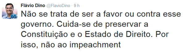 Esse é o Flávio Dino que votou no Aécio e a ele jurou amor eterno, e agora está aliançado com Dilma num projeto para afundar o Brasil. Eu não votei nessa Dilma de hoje. Votei em outra que desapareceu logos após a campanha para se transformar numa pessoa completamente diferente daquela que tantas esperanças plantou. Sou como a esmagadora maioria dos brasileiros, mais de 70%, que hoje estão decepcionados, frustrados e querendo novos caminhos.