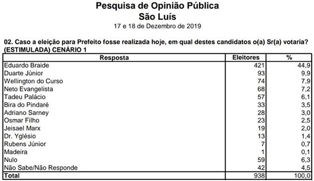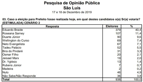 Na simulação, onde os nomes de Pastor Ribinha e Dr Joel Júnior são retirados, os números apareceram da seguinte forma: Leonardo Sá com 37,9%, Luciano Genésio 23,2% e Filuca Mendes com 20,2%. Não souberam ou não responderam somaram 7% e nenhum deles 11,5%.