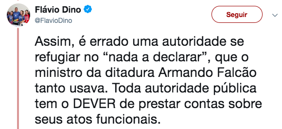 O curioso é que na semana passada, Flávio Dino disse que não aceitava o “nada a declarar” e que toda autoridade deveria prestar contas sobre seus atos. Reveja abaixo.