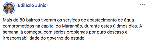 O deputado federal Edilázio Júnior (PSD) também se posicionou e lamentou o fato de que, depois de três dias, mais de 80 bairros de São Luís ainda estejam sem água.
