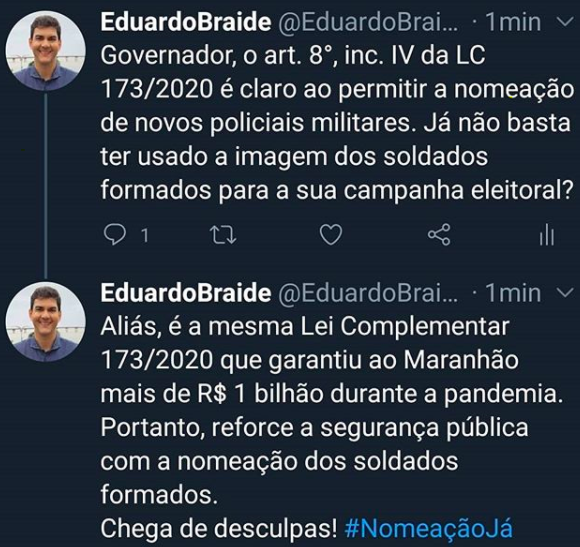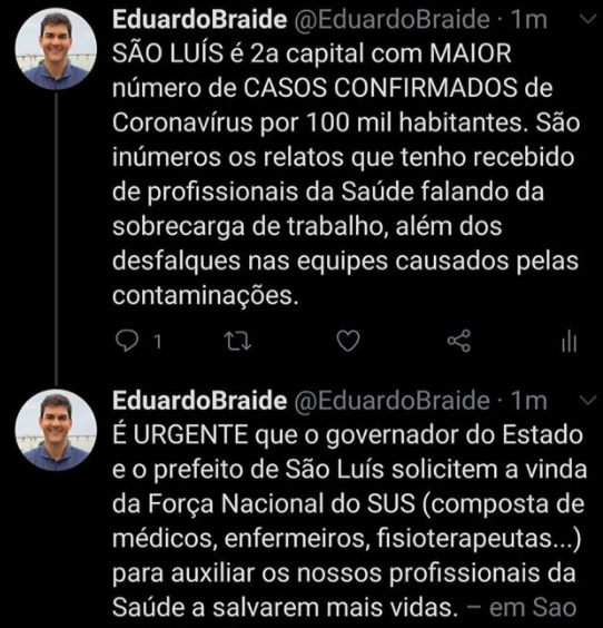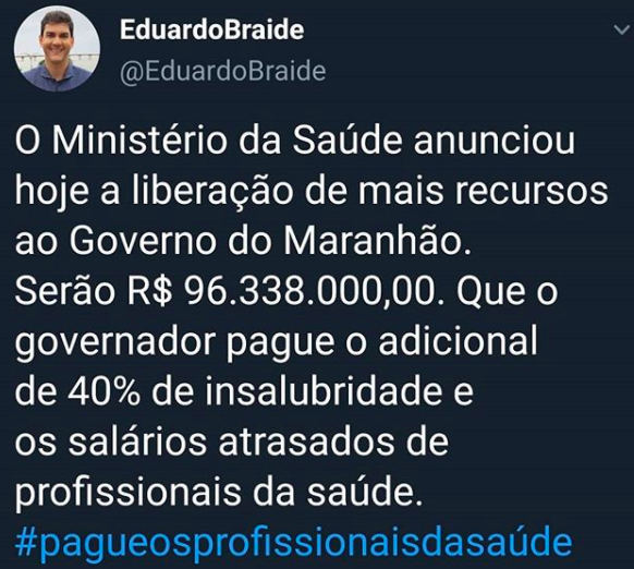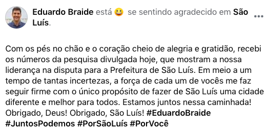 Como disse antes, o meu voto é motivado pela emoção que sinto na tentativa de acertar, ou pelo menos em errar o menos possível na escolha, por isso apoiarei Eduardo Braide para prefeito de São Luís, o único candidato que em minha opinião pode equilibrar na balança política que se encontra bastante pensa no Maranhão.
