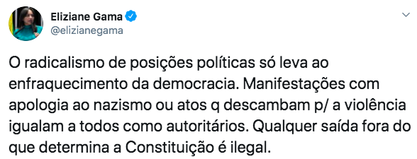 A senadora maranhense Eliziane Gama (Cidadania), utilizando as redes sociais, condenou, de maneira acertada, o radicalismo de posições políticas, infelizmente, cada dia mais nítidos no Brasil.