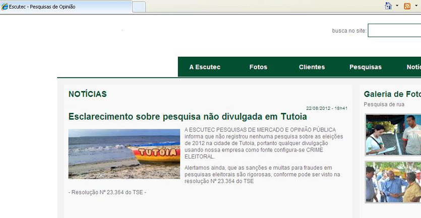 A ESCUTEC, empresa do ramo de pesquisas de opinião pública no Estado do Maranhão, e que também teve seu nome indevidamente utilizado pelo grupo do prefeito Diringa, divulgou nota em seu site na internet, informando que não registrou qualquer pesquisa sobre as eleições de 2012 na cidade de Tutóia e que a divulgação de qualquer resultado utilizando o nome da empresa configura crime eleitoral, inclusive informando que entrará com uma ação judicial contra o grupo político de Diringa (veja abaixo).
