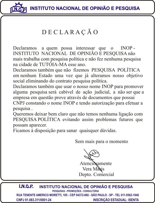 Dentre as pesquisas divulgadas na cidade de Tutóia por Diringa, seus familiares e correligionários, uma delas é identificada como tendo sido realizada pelo Instituto Nacional de Opinião e Pesquisa (INOP). Contudo, em contato telefônico com o referido instituto, que tem sede em São Paulo, seus dirigentes informaram que a empresa não atua mais no ramo de pesquisas eleitorais e não realizou qualquer trabalho de pesquisa no Estado do Maranhão. O INOP encaminhou declaração na qual atesta que não realizou qualquer pesquisa eleitoral no município de Tutóia, Estado do Maranhão (veja abaixo).