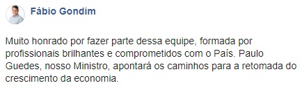 Nas redes sociais, Fábio Gondim fez questão de agradecer o convite e confirmou que irá integrar a equipe do futuro ministro Paulo Guedes.
