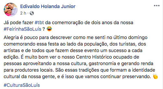 Nas redes sociais, Edivaldo fez questão de destacar a nova indicação e reconhecer o sucesso da Feirinha São Luís.