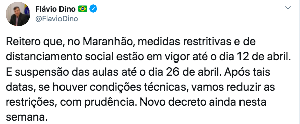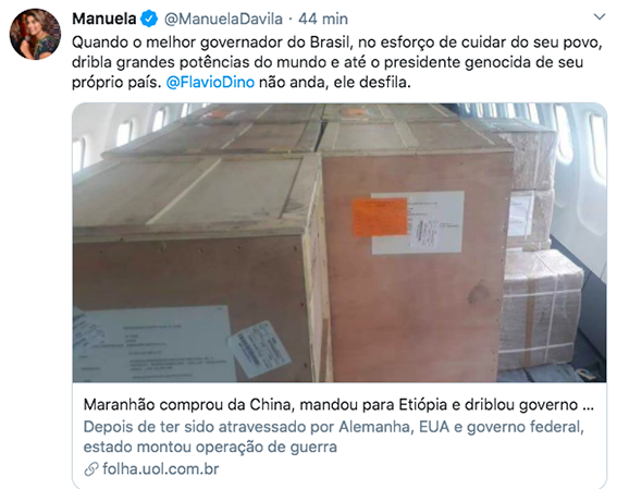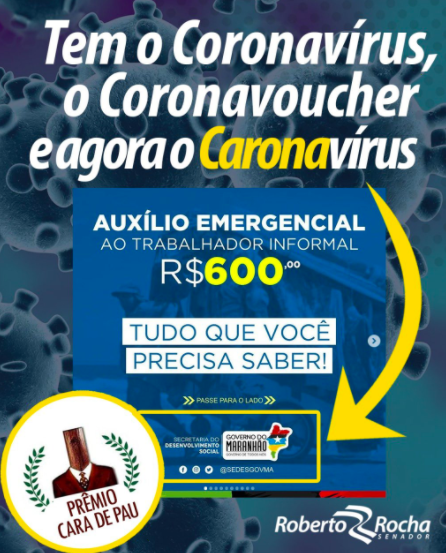 “Você sabia que o orçamento da Secom(Secretaria de Comunicação) do governo do Maranhão é o dobro da Secom da presidência da República? Somado ao dinheiro federal do Coronavírus, por que você acha que Flávio Dino aparece todo dia, o dia todo, na imprensa nacional? Ao invés de cuidar dos seus conterrâneos, preferiu gastar o dinheiro federal do Coronavírus com propaganda para se promover nacionalmente, proibindo o uso da Cloraquina por questão meramente ideológica”, declarou o senador maranhense.
