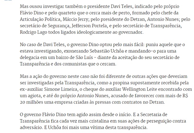 “Os secretários do governador, sustentam que não podem falar, com medo do governador e de Marcio Jerry. Mas quero dizer que isso é grave e que precisa ser combatido. Eu não vou aceitar esta prática”, completou a parlamentar.