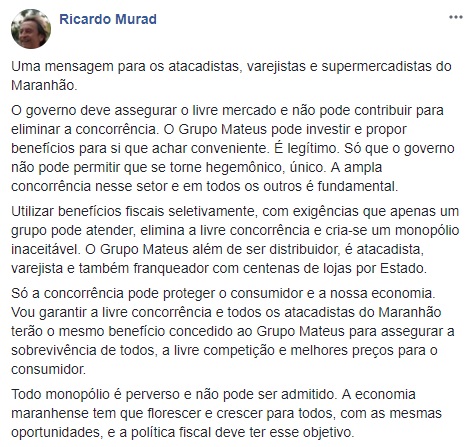 Em tempo: O Blog deixa claro que não é, e nem poderia ser, contra o benefício que deve receber o Grupo Mateus. Pela importância da empresa para o Maranhão e pela conduta idônea do Grupo Mateus, o benefício é justo, mas é injusto que apenas poucos, justamente os mais abastados, recebam tal incentivo. Sendo assim, o correto para o Blog, assim como estava nas emendas dos deputados Adriano Sarney e Eduardo Braide, seria estender o benefício para empresas também de médio e pequeno porte, afinal o lema do Governo Flávio Dino é “Governo de Todos Nós”.