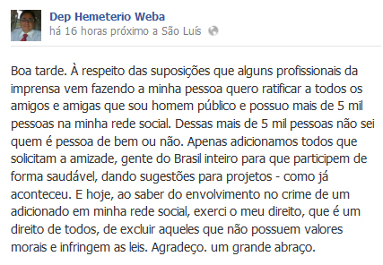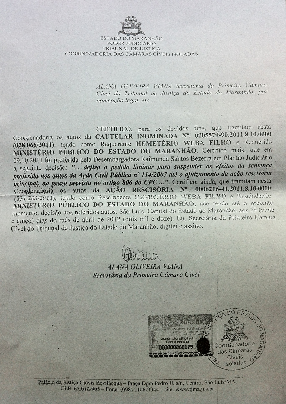 A ação penal foi proposta contra Hemetério Weba na condição de prefeito. Tramitou na Corte até que os autos baixaram para a comarca de Santa Luzia do Paruá, da qual Nova Olinda do Maranhão é termo judiciário, haja vista que o denunciado não exercia mais o cargo de prefeito e deixou de gozar de foro privilegiado. Retornou ao TJMA em razão do atual cargo de deputado estadual.