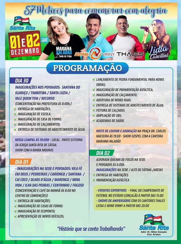 A passagem dos 57 anos de emancipação política de Santa Rita, no domingo (2), foi marcada por uma série de atividades desenvolvidas pela Prefeitura. Destaque para as obras de extrema relevância para a população. Desde sexta-feira (30), o prefeito Hilton Gonçalo e sua comitiva entregaram vários equipamentos urbanos, assim como participou de atividades esportivas e culturais.