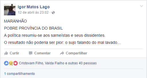 “A política [no Maranhão] resumiu-se aos sarneístas e seus dissidentes. O resultado não poderia ser pior: o sujo falando do mal lavado.”, comentou.