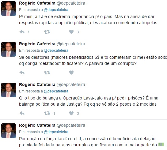 Ontem, por exemplo, criticou, por meio de postagem na sua conta pessoal no Twitter, a tentativa de abafar a Lava Jato com a justificativa de salvar a política.