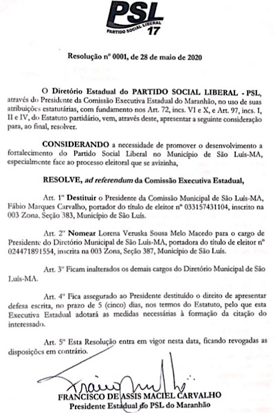 Uma das Fake News que Lorena Macedo tem sido alvo é de que não assumiu a presidência do PSL na capital. O Blog teve acesso ao documento, assinado no dia 28 de maio, pelo próprio presidente do PSL no Maranhão, vereador Chico Carvalho, nomeando Lorena e destituindo o próprio filho, Fábio Marques. Veja abaixo.