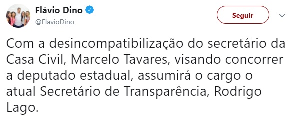 Cafeteira – Outro nome praticamente certo na nova equipe de Flávio Dino é o do deputado estadual Rogério Cafeteira. O Líder do Governo na Assembleia não conseguiu obter sua reeleição, mas como possui a confiança e o reconhecimento do governador pelos serviços prestados, durante os últimos quatro anos, deverá ser convidado para compor a equipe do comunista.