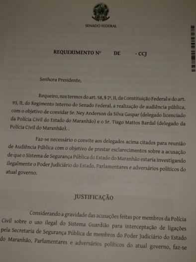 A comissão também já encaminhou solicitação ao juiz da 1a Vara Criminal de São Luís, Ronaldo Maciel Oliveira, para garantir o deslocamento de Tiago Bardal para a sede da Polícia Federal, no sentido de prestar esclarecimentos ao membros da comissão sobre as denúncias de grampos e investigações ilegais e/ou sem autorização que teriam sido realizadas e ordenadas no Maranhão.