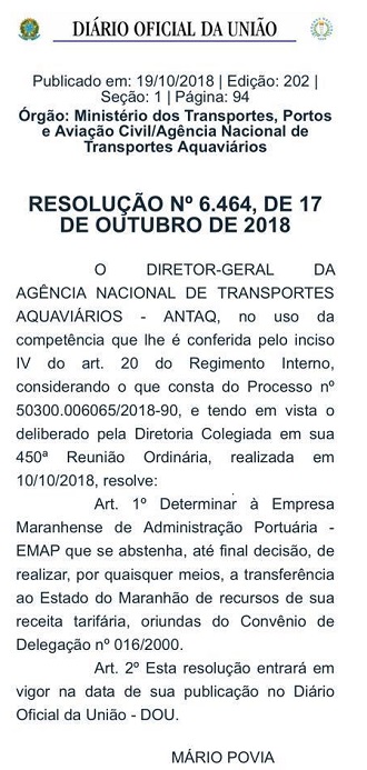“O DIRETOR-GERAL DA AGÊNCIA NACIONAL DE TRANSPORTES AQUAVIÁRIOS – ANTAQ, no uso da competência que lhe é conferida […] resolve: […] Determinar à Empresa Maranhense de Administração Portuária – EMAP que se abstenha, até final decisão, de realizar, por quaisquer meios, a transferência ao Estado do Maranhão de recursos de sua receita tarifária, oriundas do Convênio de Delegação nº 016/2000”, diz o documento.