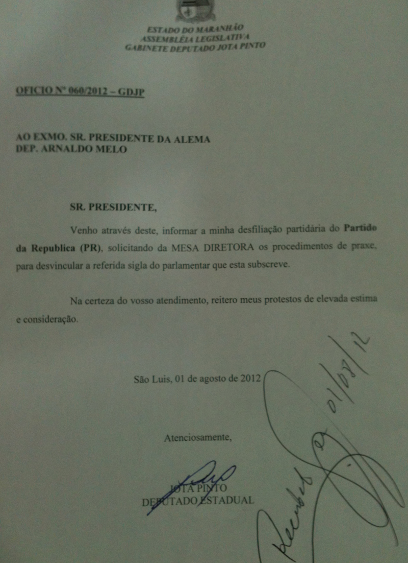 É com grande dissabor que comunico a minha desfiliação do partido que ajudei a fundar, no Maranhão, em 1986, sob a inspiração de Álvaro Valle, e que mais tarde viria a ser a base do Partido da República, que também ajudei a organizar, em 2006, desta feita com Enéas Carneiro e um punhado de companheiros da antiga e nova legenda.