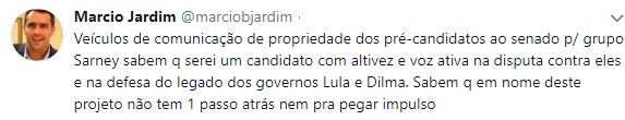 Só que, por falta de coragem ou subserviência ao extremo, Márcio Jardim acabou errando o alvo das suas críticas e direcionou sua postagem a veículos de comunicação que seriam atrelados aos pré-candidatos ao Senado na chapa da ex-governadora Roseana Sarney – Edison Lobão e Sarney Filho.