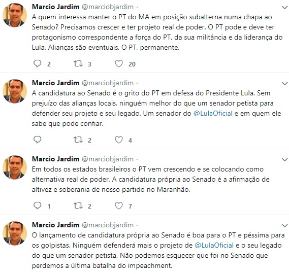 Jardim entende que uma candidatura do PT ao Senado é um “grito de defesa do presidente Lula” e que é péssima para os golpistas. Além disso, ele questiona “a quem interessa manter o PT do MA em uma posição subalterna em uma chapa para o Senado?”. Vejam abaixo as colocações pertinentes e justas de Márcio Jardim.