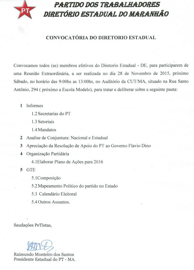 O Partido dos Trabalhadores de São Luís, a princípio, realizaria sua convenção na parte da tarde desta quarta-feira, onde pretende confirmar apoio à reeleição do prefeito Edivaldo Júnior (PDT). O PT também disputa com outros partidos a indicação do companheiro de chapa de Edivaldo.